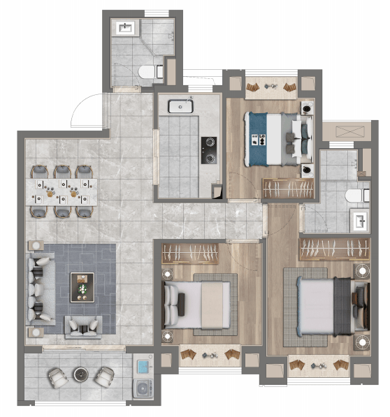 老实说,这个户型有3个卧室,很符合三口之家偏改善或者是二胎家庭的居住需求。