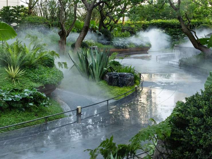 依托19米天然高差与315米超尺度中庭,天府九里构建了一座“立体公园社区”。景观不仅是对巴蜀山水风貌的当代转译,更通过多元场景激活、全龄功能植入及四季植物叙事,重新定义了公园城市的居住范式。