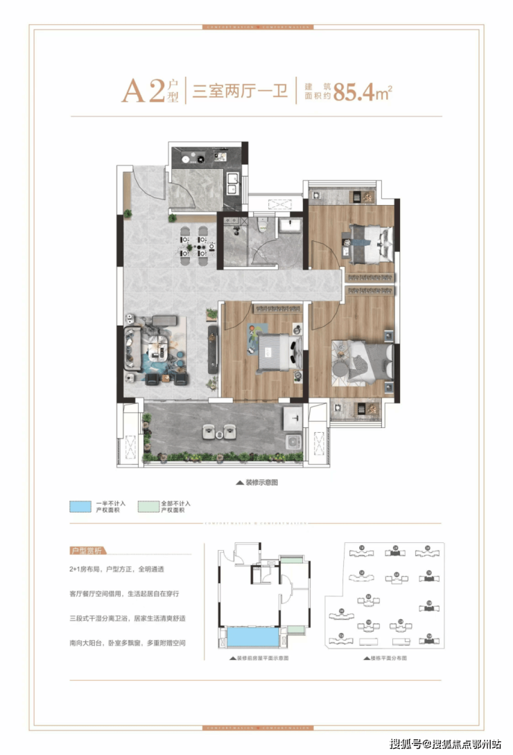 近年比较流行的 百平三房双卫户型,有限的空间里也能有完善的功能;甚至还做到了 南北双阳台,空间更通透,居住舒适度非常高。
