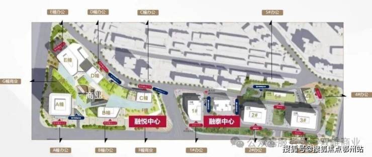 C1地块融悦中心:占地3.1万㎡,总建27.9万㎡,含ABCDE五栋办公+6万㎡商业;