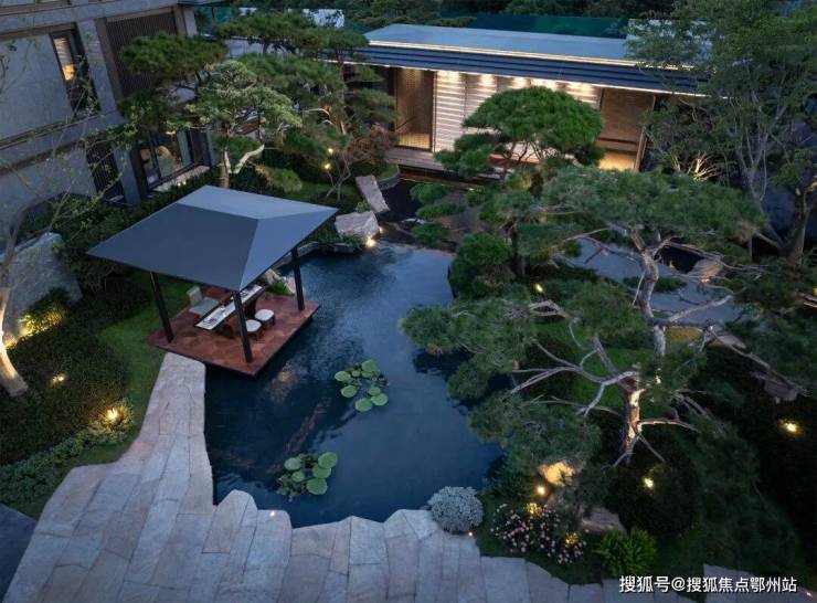近460㎡的下沉式庭院,精选太行山金景石堆叠成小山丘,引进溪水汇聚成池塘,