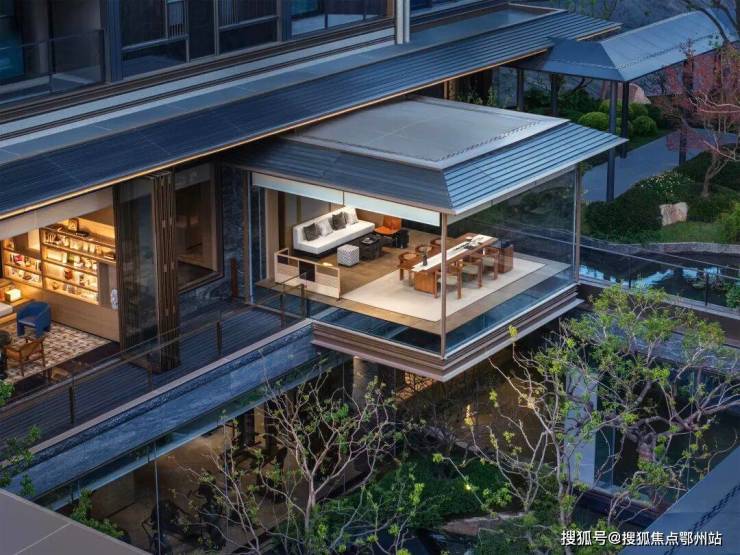 三面悬挑的玻璃结构凌驾于水景之上,既可俯瞰下沉庭院全景,又成为景观的一部分,是商务洽谈与亲子时光的理想场所。