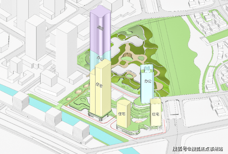 办公楼、住宅、商业、文化等功能的导入,使得项目的建筑群形成了高度复合的城市综合体。