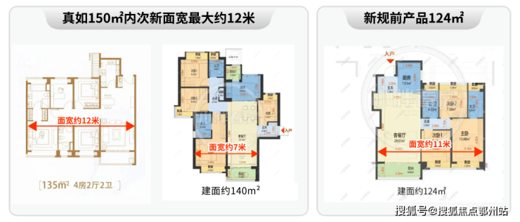 对比新规前产品 :新规前120㎡段户型,南向面宽普遍11米上下,环宇玖章面宽优势同样显著。