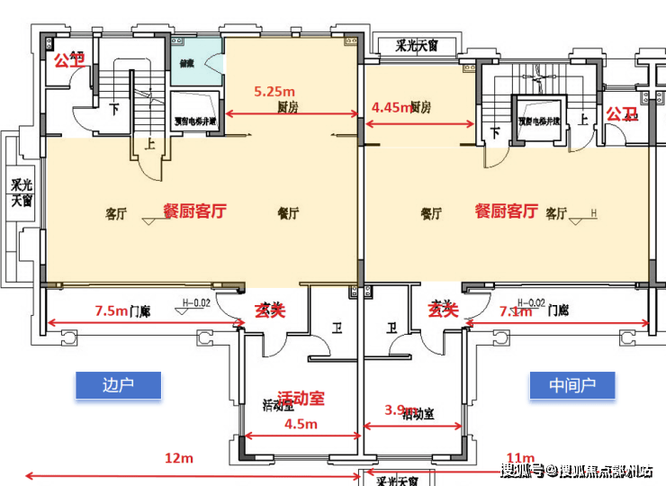 具体来看,首层主要为餐厨客厅及活动室,边户南向面宽约12米,中间户南向面宽约11米,每一户均为3层。