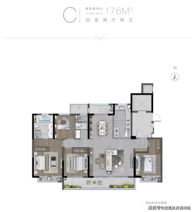 产品方面更是定位高端改善,建面约118-218㎡,面积段相当纯粹,更是直击盐城高端改善的心门。今天主力给大家推荐一下建面约176㎡的四房两厅两卫的大平层。
