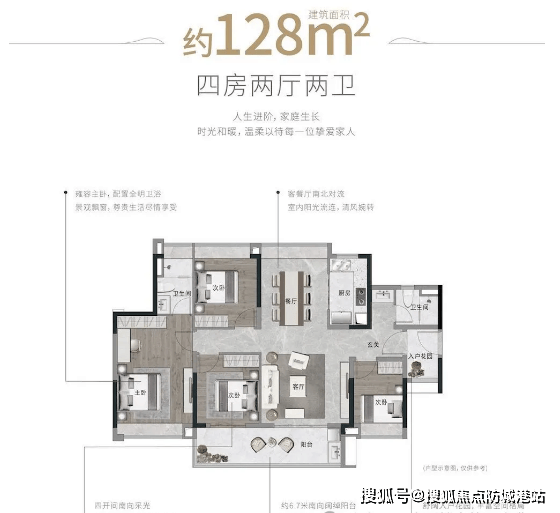 建面约128㎡四房两厅两卫(奢阔进阶大四房):适配改善型家庭,约6.7米南向阔绰阳台,采光观景效果极佳,闲暇时凭栏远眺,帽峰山山景与社区园林美景尽收眼底。四开间南向采光设计,实现南北对流,让室内始终保持空气清新。舒适入户花园多一重收纳与安全空间,归家仪式感拉满。雍容主卧配备全明卫浴,彰显尊崇生活格调,满足家庭对品质生活的追求。