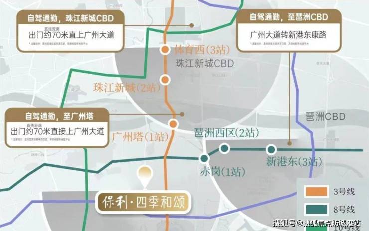 保利四季和颂周边拥有发达的地铁网络,包括3号线、8号线、10号线和11号线,实现了与广州各大主要商圈和交通枢纽的无缝对接。尽管四个地铁站距离楼盘都在1.5-1.8km之间,但开车出门即上广州大道,畅达珠江新城、体育西、琶洲等地,极大提高了出行效率。
