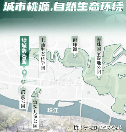自然景观:项目背靠河涌,打造了一座滨河公园,与周边的海珠儿童公园、海珠湖、海珠国家湿地等共同构成了巨大的天然生态背景板,提供了优质的居住环境。