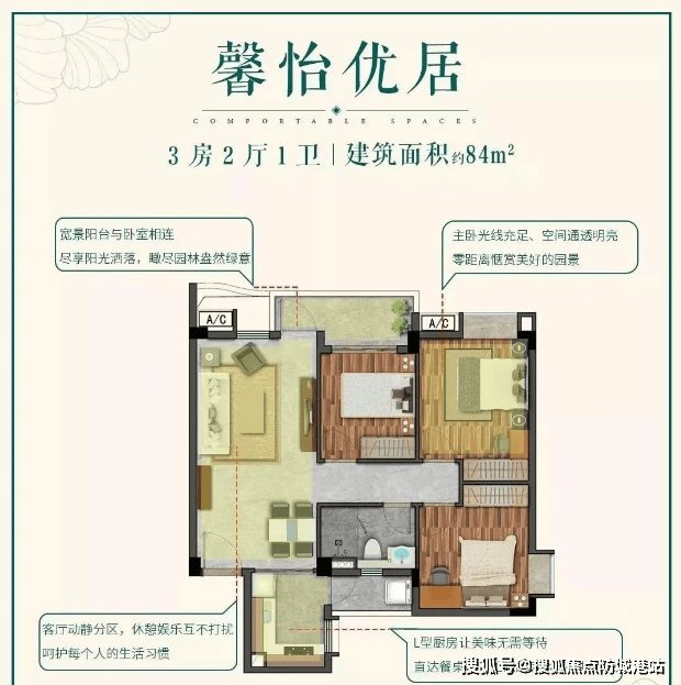 约84㎡三房两厅一卫:得益于超高的空间使用率和大跨度阳台,客厅和书房均可出阳台,卧室飘窗设计提升整体采光面。