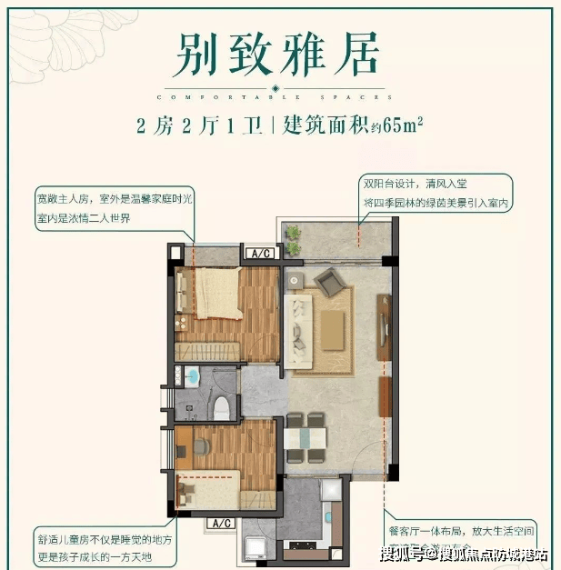 约65㎡两房两厅一卫:该户型设计紧凑合理,功能分区明确,空间感出色,加上双阳台设计,使用率高。