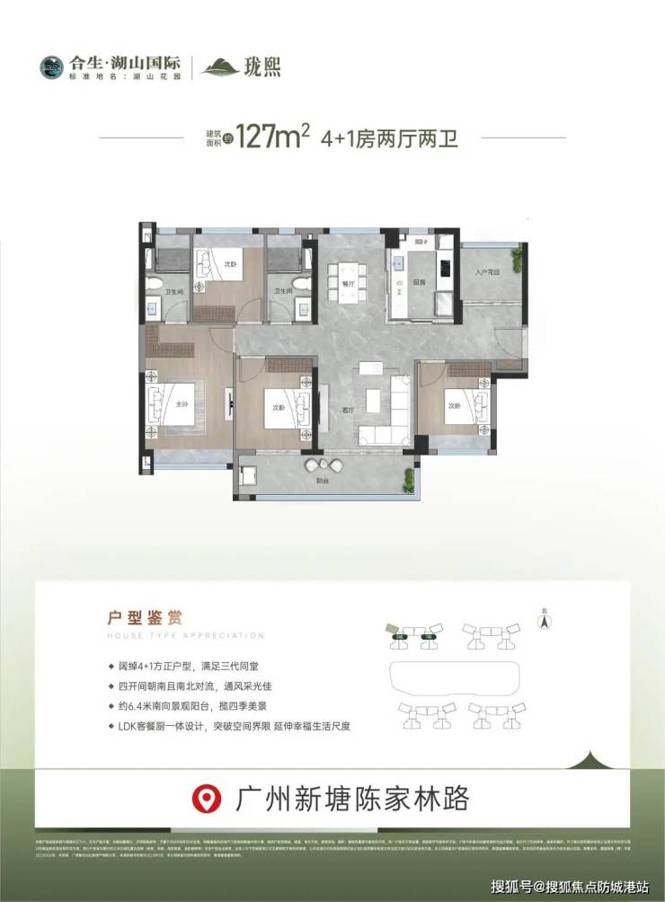 127方的4 + 1房户型具备诸多优势。四开间朝南且南北对流的设计,保证了良好的通风采光效果。室内空气能够自然流通,时刻保持清新,充足的阳光也能为居住者带来温暖与活力。约6.4米的南向景观阳台,为业主提供了一个欣赏美景、放松身心的好地方。LDK客餐厨一体设计同样应用于此户型,使得空间布局更加合理,增强了家庭成员之间的互动,提升了居住的舒适度与便利性,让生活更加从容自在。