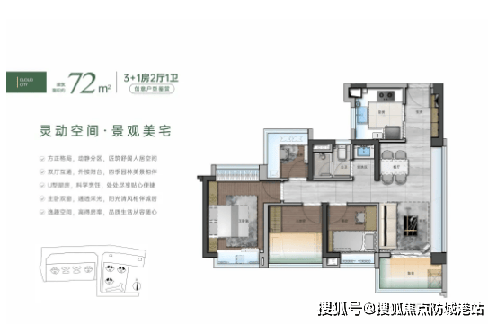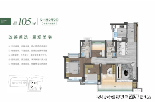 一期在售户型为72-88-105㎡四房户型,该系列户型最大的亮点是超高使用率,其中72㎡户型可做到四房,在同面积段产品中极具竞争力。户型布局方正,空间利用率高,无浪费面积;客厅连接阳台,采光通风效果优越,让室内空间更显通透;卧室均配备飘窗,拓展了使用空间的同时,也为业主提供了舒适的观景、休闲区域;厨房采用U型或L型布局,操作动线合理,烹饪更便捷。