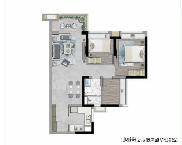 约80㎡的2+1房2厅1卫户型,采用动静分区设计,U型厨房合理利用空间,性价比极高。