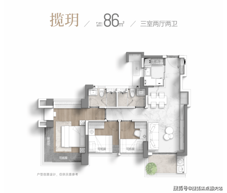 86㎡三房:南向四开间全朝南,主卧270°飘窗,实用率超100%;