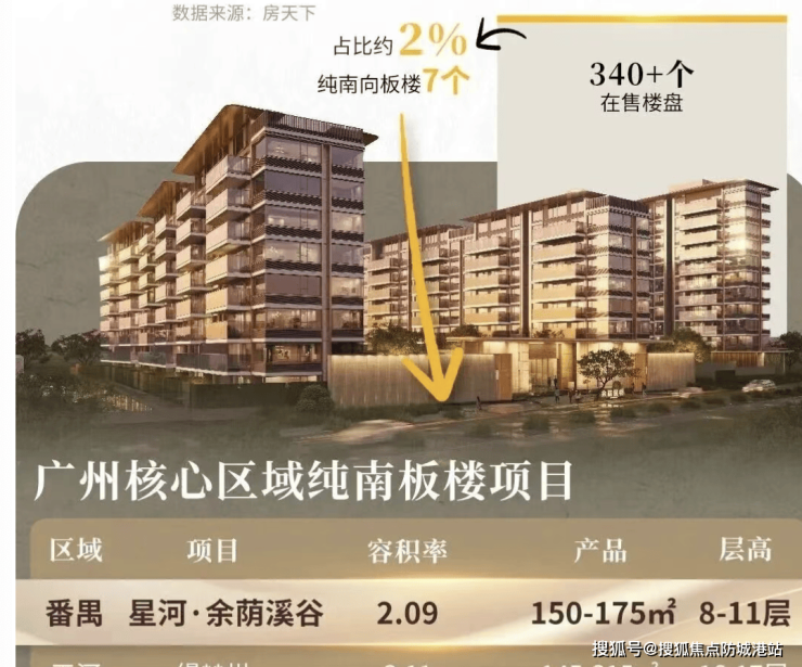 根据不完全统计,广州核心区域在售盘340多个,做到纯南向板楼的不到10个,占比仅约2%,如果再叠加低密8-11层洋房,则只有我们星河·余荫溪谷(数据来源:广州市住建局,2026年4月最新统计)。