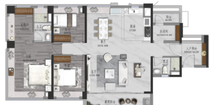 约 140㎡ 4 房 2 卫:LDK 一体化联厅,是亲朋聚会的好场域;南北通透,客厅近 6 米超大进深;阳光入户花园,增添生活惬意;阔绰主卧套房,搭配 270° 景观飘窗,尽享舒适生活。