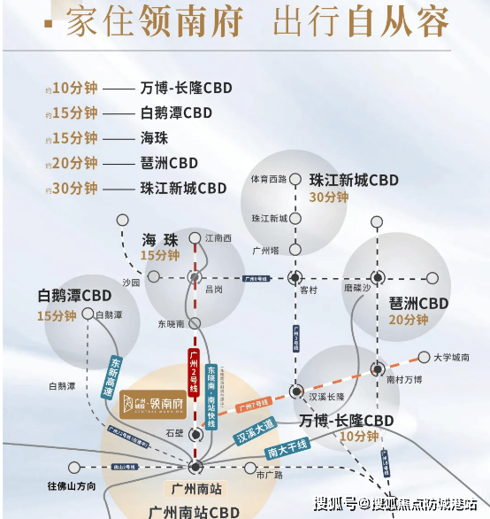教育:项目未配建幼儿园,最近的石壁二村幼儿园约 800 多米。小学为小区旁省一级的南站小学,但名气一般,初中需到约 3 公里外的广东第二师范学院附属学校,距离较远且位置相对偏僻,教育资源有待进一步优化。生活:空间布局为 “一轴两涌 + 一核五区”,旨在打造站城一体的大湾区门户枢纽。一条汉溪大道串联多个商圈,尽享城市繁华。除自家底商,约 26 万㎡南站花城汇商业走路 20 来分钟或开车不到 10 分钟可达,还有多个商业综合体在建。周边有广州足球公园、大象岗森林公园、长隆旅游度假区等文旅体资源,内部打造约 3.6 万㎡私家园林,规划各类娱乐休闲康养设施。