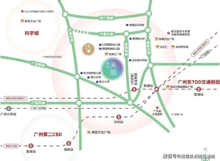 尽管香江天辰距离最近的地铁站(13号线沙村站)约有2.8公里的距离,但通过自驾或乘坐社区提供的楼巴可以轻松解决出行问题。此外,项目周边还有广深高速、广园快速等主要道路,极大地提升了通达性。规划中的28号线陈家林路站预计建成后将进一步改善项目的交通状况,使居民能够更便捷地到达天河、海珠、黄埔等区域。