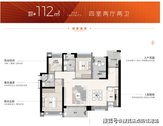 112㎡三房户型,为南北通透的双阳台设计,观景和生活两不误;主卧套房设计,带有独立卫浴和飘窗;次卧连接阳台,采光通风良好。