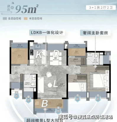 约95㎡四房两厅两卫:五开间朝南,超阔瞰景阳台,南北对流设计,奢阔私密主卧套房。