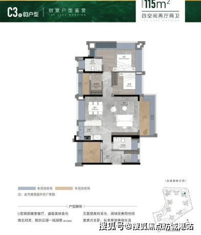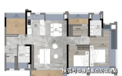 约84㎡三房两厅两卫:南向双瞰景阳台,U型明厨设计,阔绰套房式主卧。