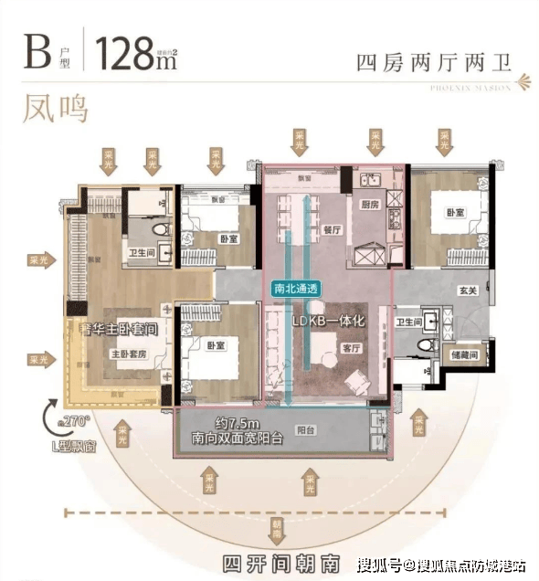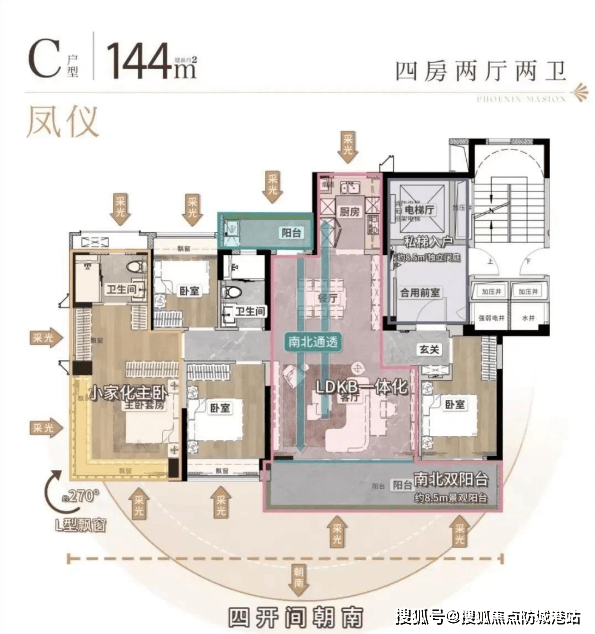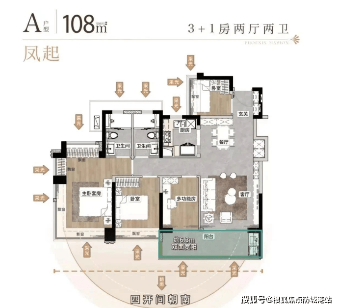 凤凰于飛推出了建面约108-144平方米的多种户型选择,所有户型均设计为四房结构,强调南向低密社区的概念。例如,凤起系列建面约108平方米的3+1房户型,具有南向四开间设计,配备约6.3米双面宽阳台,LDKB一体化设计,以及700库收纳空间,主卧还配备了约270°飘窗,实现了接近100%的使用率。凤鸣和凤仪系列则提供了更大的空间选择,尤其是凤仪系列采用了板楼设计,南北通透,私密性更佳,并且配备了私梯入户,提升了居住舒适度和尊贵感。