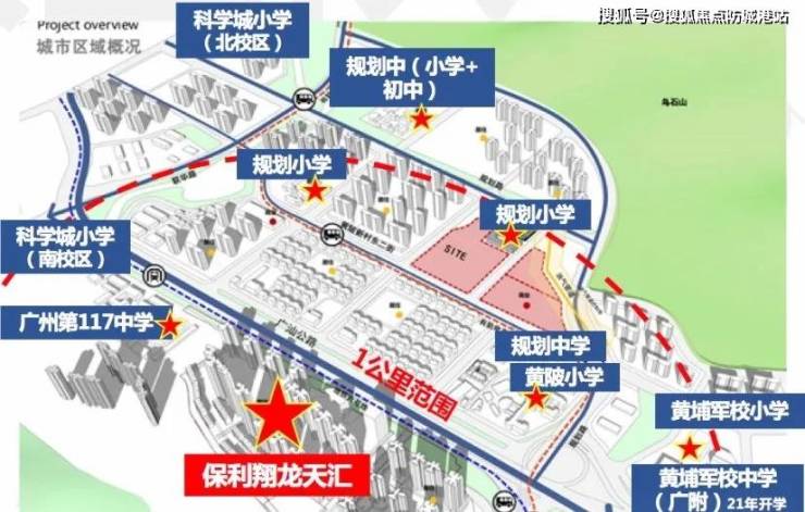 项目约1公里,可步行的范围内,小学有5所(含已规划的一所),包括科学城小学、黄陂小学、黄埔军校小学、联和小学;中学2所,为117中学和黄埔军校中学。(注:学校地段划分以当年教育局公布信息为准)