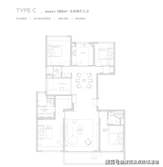 该户型的厨房采用U型设计,操作空间充足,布局合理,洗、切、炒动线流畅,方便业主进行烹饪操作。厨房与餐厅相邻,用餐便捷,同时餐厅也连接阳台,进一步提升了空间的采光与通风效果。三个卫生间均为干湿分离设计,保持了室内环境的干燥整洁,使用起来更加方便卫生。主卧室配备独立卫生间与衣帽间,提升了居住的舒适度与尊贵感,满足了高端人群的居住需求。