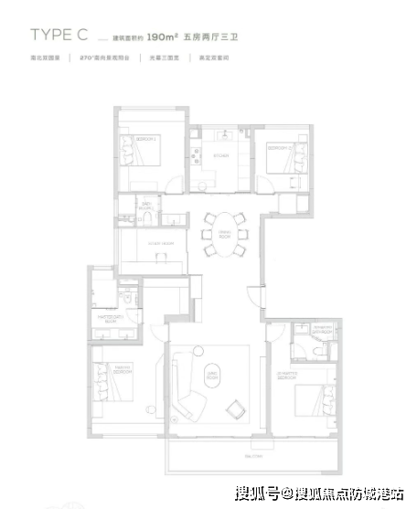 越秀观樾的户型设计独具匠心,建面约 125-250㎡的大平层,以全生命周期设计哲学,精准匹配峯层人士的进阶需求。户型为低密板楼设计,2 梯 2 户,相当于 1 梯 1 户,业主从电梯出来后,往两个不同方向回家,互不干扰。户型采用豪宅主流的 LDKG 一体化设计,54 平无边社交方厅,将公区空间的宽敞通透展露无遗。全屋窗地比高达 38%,远超广州常见的 0.25 住宅窗地比,主卧设置 270° 大飘窗,让业主站在室内的不同位置,都能尽揽美景。