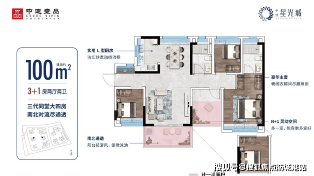 建面约100㎡:四开间朝南,南向大阳台瞰景,三代同堂的理想选择。