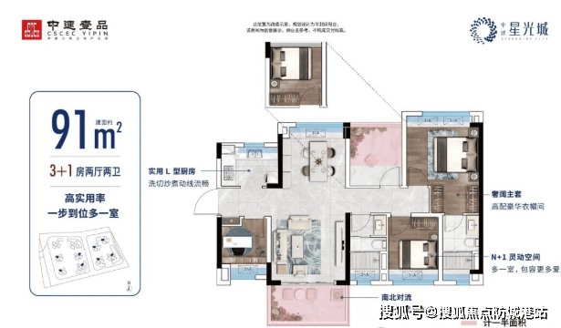 建面约91㎡:南北通透4房,宽敞通透尺度,适合大家庭居住。