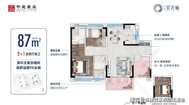 建面约87㎡:南北通透主套大3房,纯南向设计,通风采光俱佳。