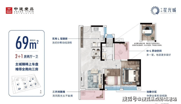 建面约69㎡:主城臻稀南向三房,三开间朝南,采光极佳。