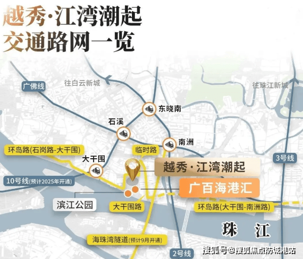 项目距离地铁10号线大干围站仅约650米,方便快捷到达市区核心板块。海珠湾隧道预计今年开通后,到广州南站通勤时间将缩短至约15分钟。此外,项目门口的环岛路(石岗路-大干围路段)也将于今年开通临时道路,大大提升整个板块的通行效率。