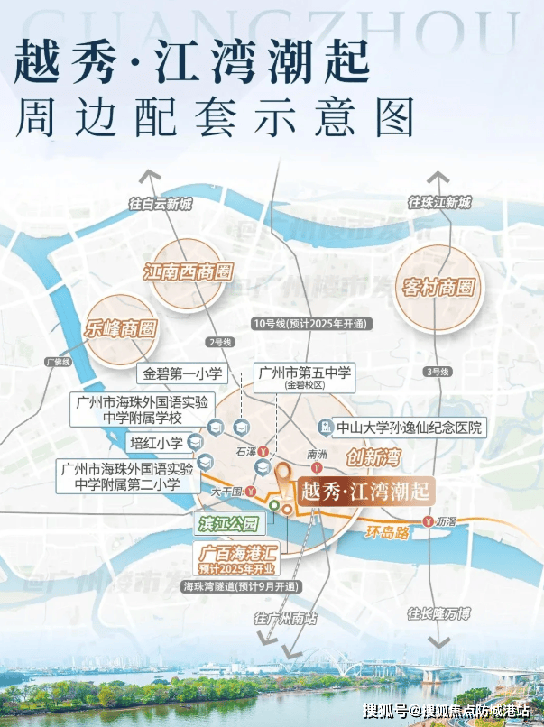 越秀·江湾潮起自带建面约3.4万平方米的商业Mall,计划引入奢侈品旗舰店、五星级酒店、商务办公等业态,未来将融合娱乐、休闲、体验、社交等全维度场景,带来宛如香港海港城的消费购物体验。广百海港城已于2023年12月12日正式封顶,预计今年底正式开业。周边商圈包括东晓南、江南西、乐峰广场等,满足日常购物需求。
