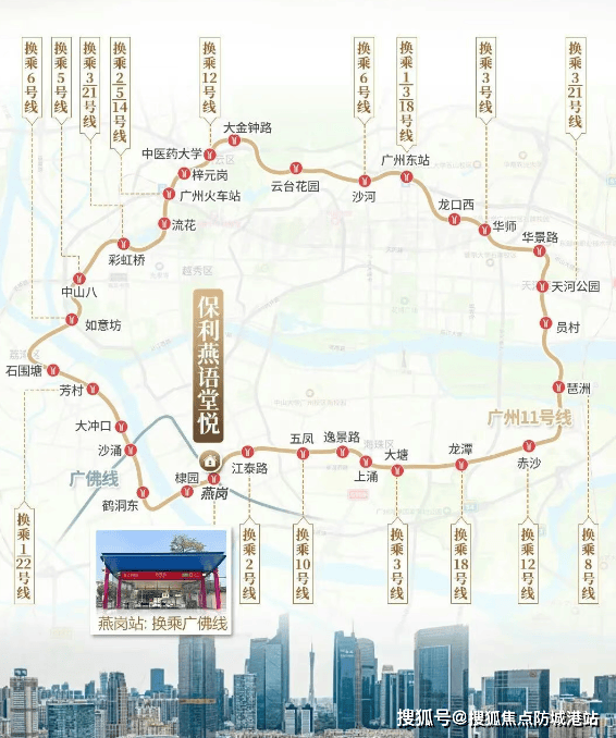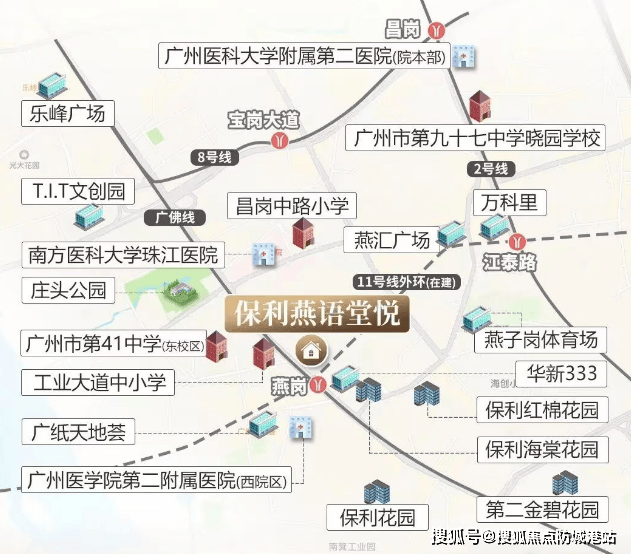 保利·燕语堂悦距广佛线与11号线交汇的燕岗地铁站步行距离不足200米,属于实打实的地铁上盖楼盘,这也是项目核心交通优势之一。广州地铁11号线作为环线线路,可快速串联海珠、天河、越秀等主城区,8站即可直达琶洲片区,适配琶洲商务区上班族的通勤需求;广佛线可无缝换乘3号线,7站抵达珠江新城,同时衔接佛山城区,满足跨城出行需求。项目紧邻工业大道主干道,向北衔接昌岗中路、内环路,向南5分钟左右可接驳新滘西路、环城高速,自驾出行可快速通达广州各大核心片区。