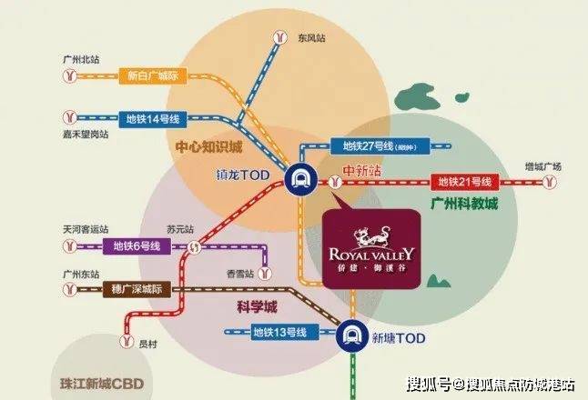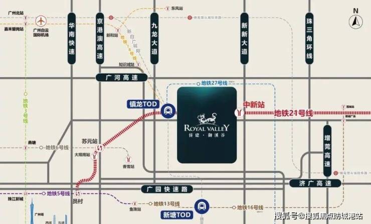 拥有四纵六横的交通网络,堪称广州东核心交通枢纽,是广州罕有的7地铁口上盖别墅物业。地处地铁21号线中新站之上,4站即达天河,1站可到镇龙TOD枢纽