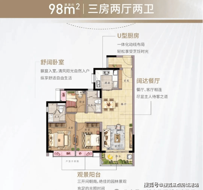 98平方米三房两厅两卫:布局合理,功能齐全,适合三口之家。
