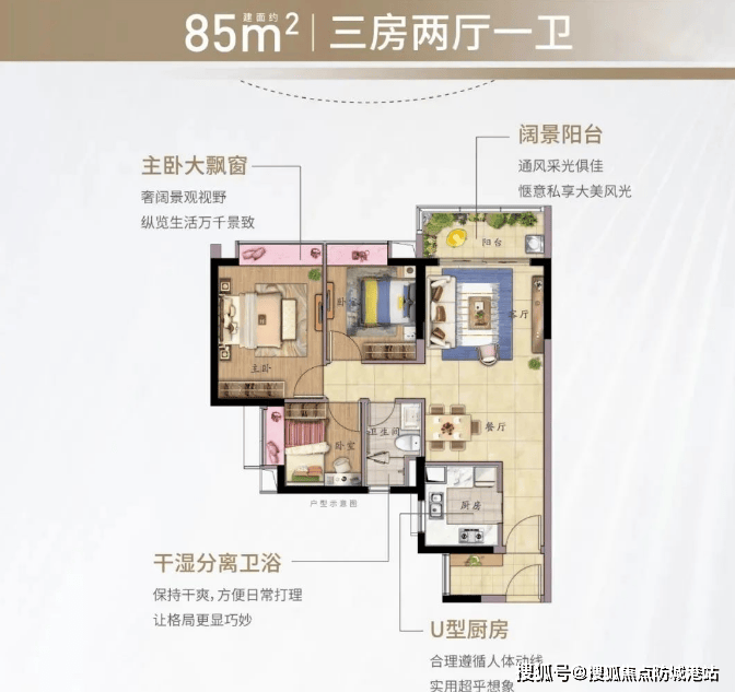 85平方米三房两厅一卫:紧凑实用,适合年轻夫妻或小家庭。