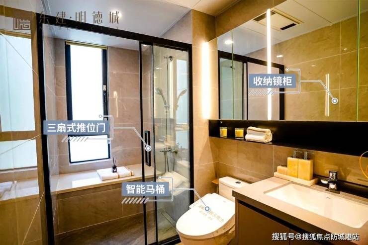 其他细节如子母式精雕铝板防火装甲门,双开门设计更气派;阳台推拉门设计,灵巧不费力;厨卫的智能马桶、三扇式推拉门、收纳镜柜等就更实用了。