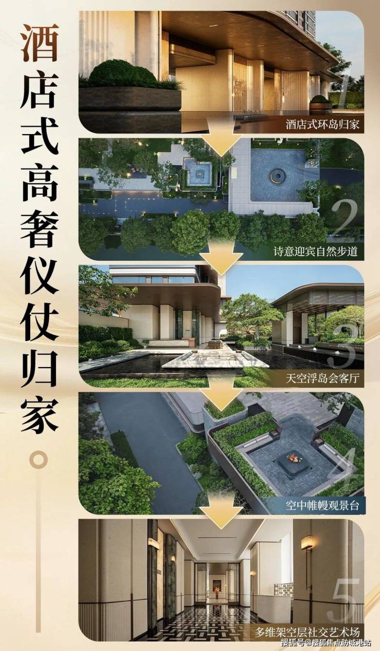 五进院归家仪仗:从酒店式环岛到浮岛会客厅,再到多维架空层,层层递礼,营造出尊贵的归家仪式感。
