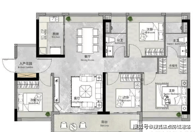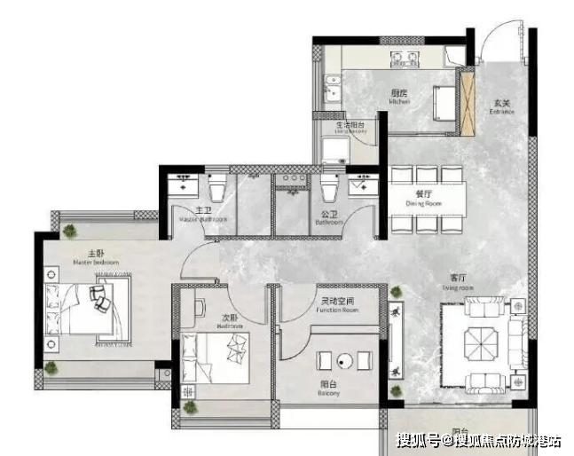 94㎡三房两卫户型采用四开间朝南设计,三个卧室全部朝南,保证充足的阳光照射;