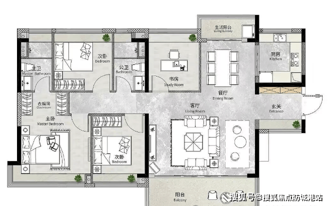 110㎡四房两卫户型则实现了南北通透,客厅宽度达到3.8米,连通6.5米长的大阳台;