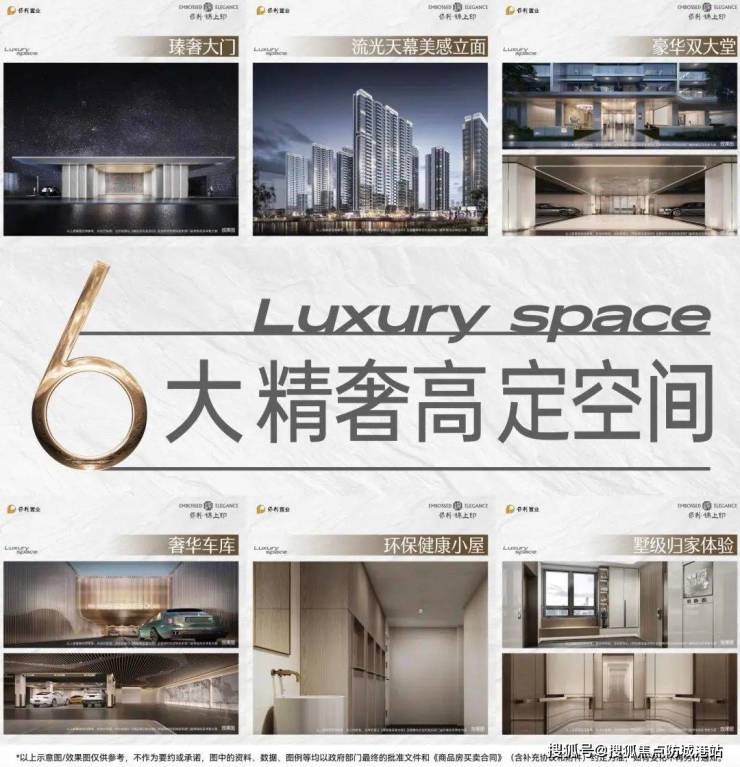 高端精奢社区配套:包括星级酒店式社区主门楼、豪华双大堂、奢华车库等六大精奢高定空间。