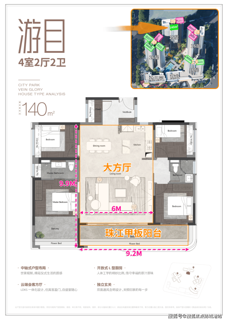 其中本次主角建面约140平四房游目户型,朝向为南向,直望大园林和自然江景。