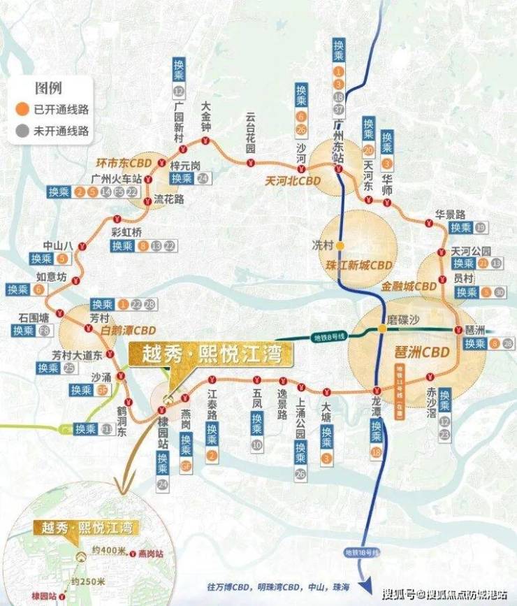 项目距离广州地铁11号线棣园站约250米,步行5分钟内可达;同时距广佛线燕岗站B口约400米,双地铁加持下,7站到琶洲、7站到广州南站基本可实现。早高峰打车去珠江新城CBD,实测平均耗时约25分钟。周边1公里内有38个公交站点,最近的纸厂总站①仅78米,南石头便民1线、469路、544路等多条线路覆盖日常通勤动线。