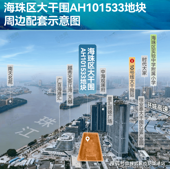 * **【地段与资源】**:地处粤港澳大湾区中轴,位于海珠创新湾核心区大干围板块,正构建“一区一谷一湾”创新发展新格局。距离珠江后航道仅200米,是广州罕见的南向一线临江住宅。距离在建的地铁10号线大干围站约650米,预计2025年年底通车,另有地铁2号线南洲站和广佛线石溪站,自驾有环岛路、广州环城高速,海珠湾隧道预计2025年开通,开车到广州南站仅需约15分钟。