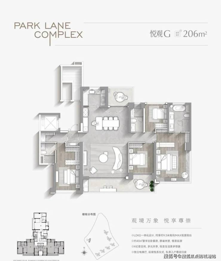 建面206㎡,一层虽然共有三户,但是每户带独立电梯厅,南北对流设计,南向阳台长约9.3米,13栋直面长隆欢乐世界景观非常好,双主套。