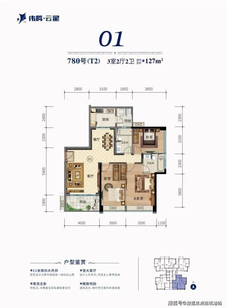 伟腾云星推出的压轴楼王T3栋共有130套房源,户型面积从约82㎡至131㎡不等,涵盖二房到三房的选择。每个户型都南北对流,带有入户花园,方正实用,赠送面积多,超宽楼距,前后无遮挡,让住户可以独享白云山的壮丽景色。
